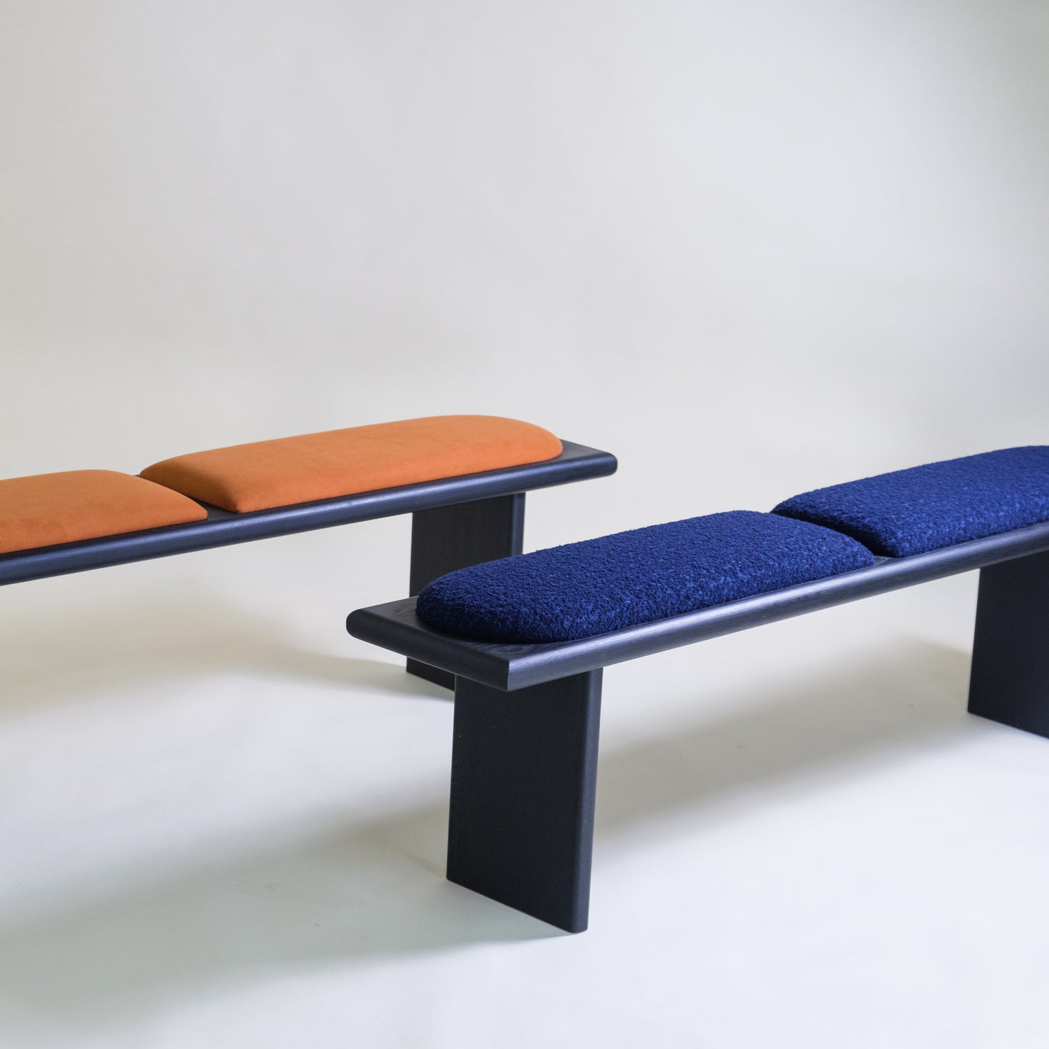 The Whispering Bench is designed with two textile options: wool bouclé and fine Sensuede.