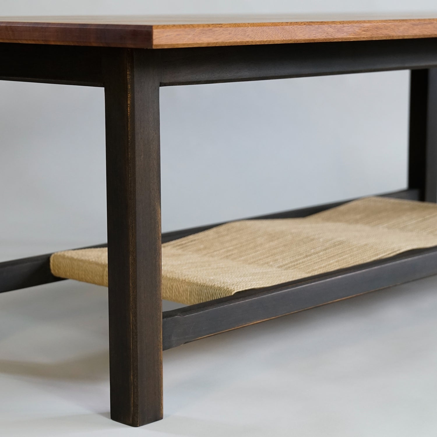 We weave this shelf with laced danish cord. This natural material is both beautiful and durable, and has been used by furniture craftsmen for ages. You may recognize this material from European chair design and modern seating offerings.