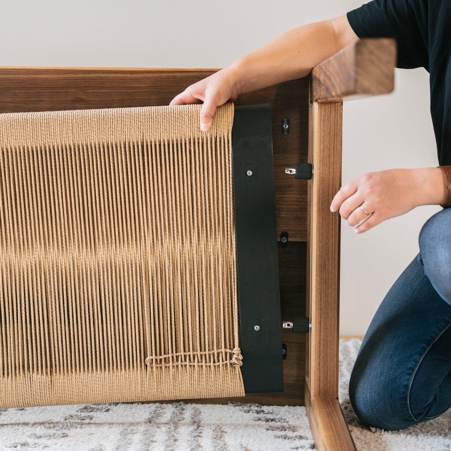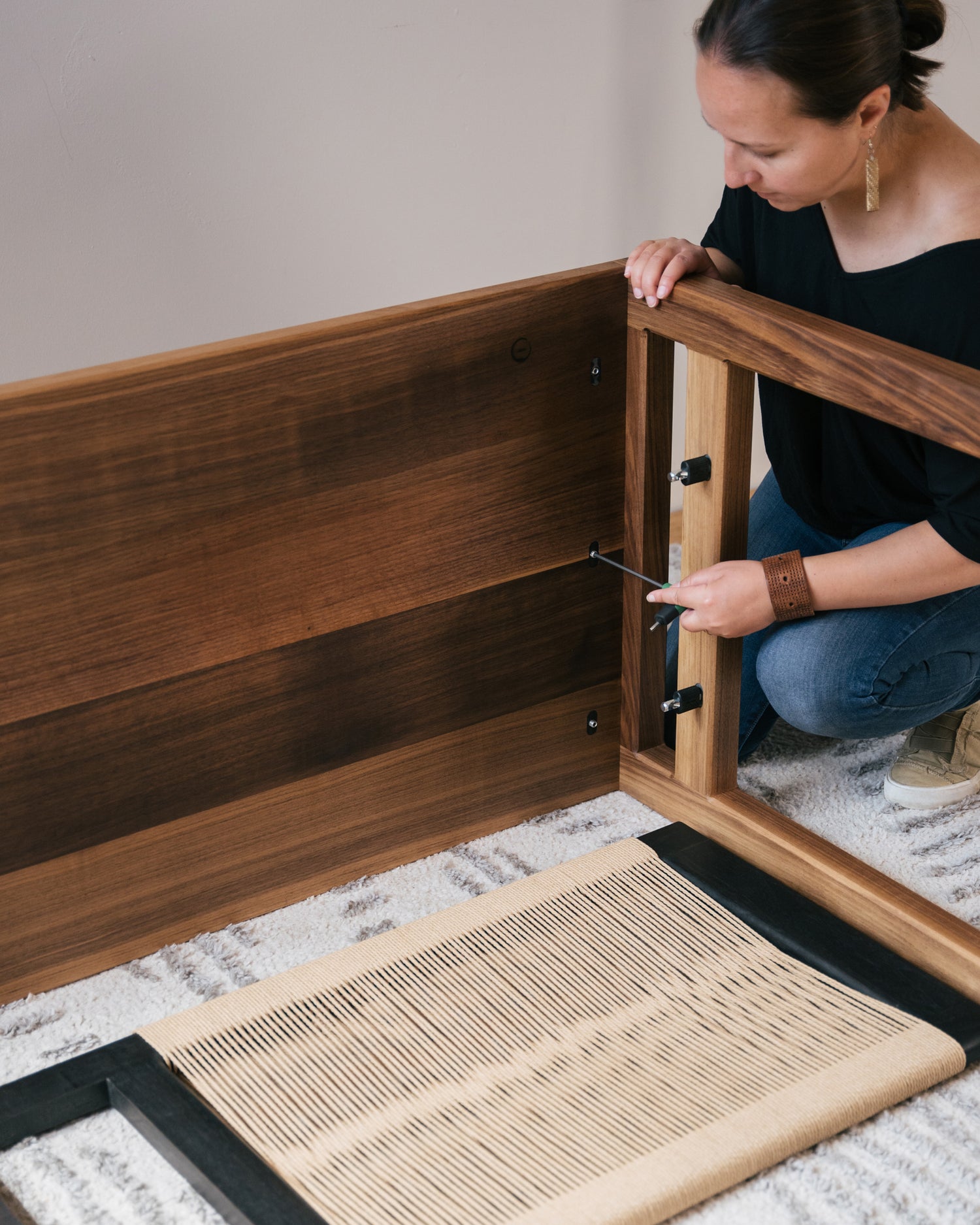 Holly, Co-founder & Interior Designer, assembles the Kamehana Desk in Walnut.